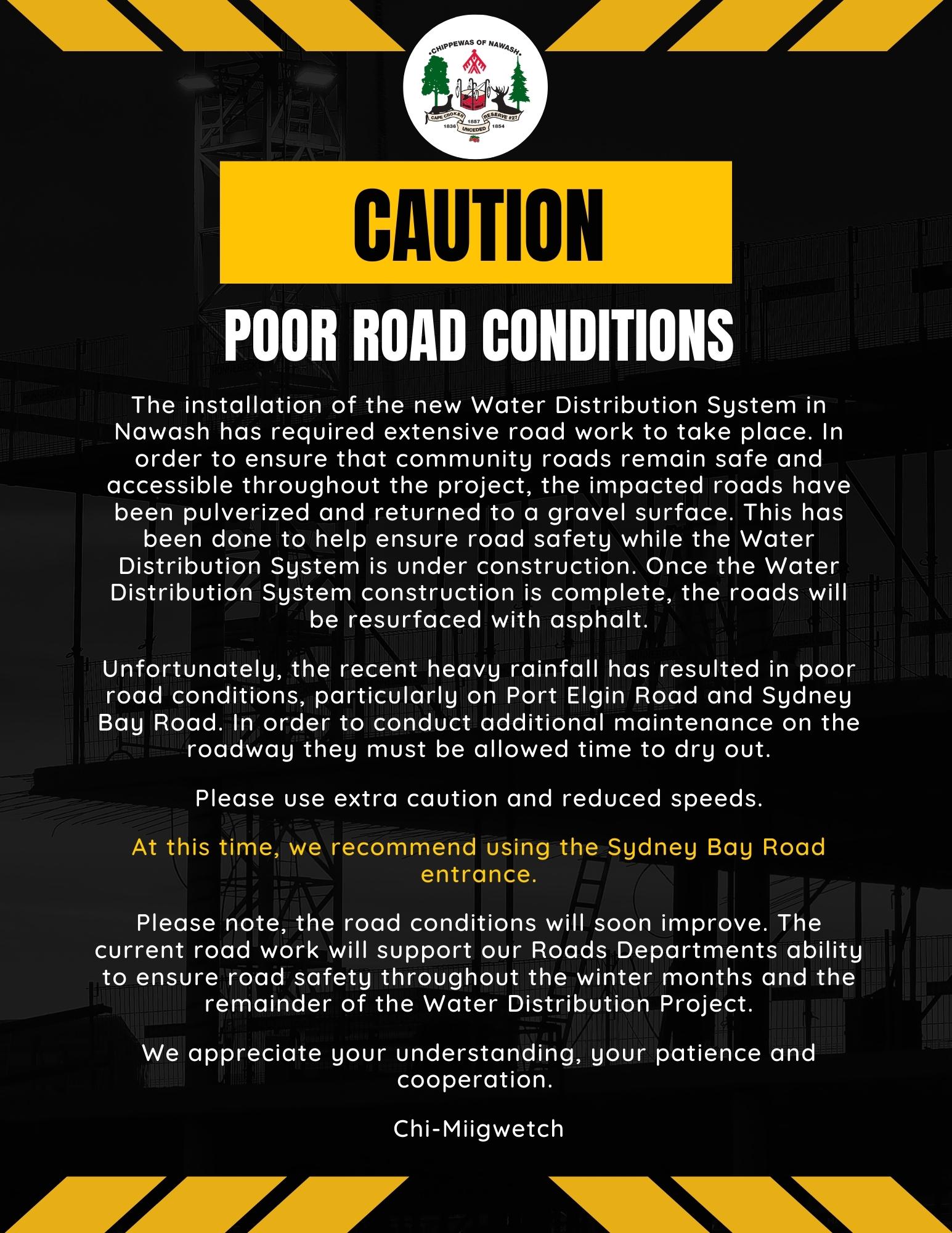 Oct 21, 2022: Caution – Poor Road Conditions in Neyaashiinigmiing. Posted on October 21, 2022October 21, 2022 Posted in Post Archives.