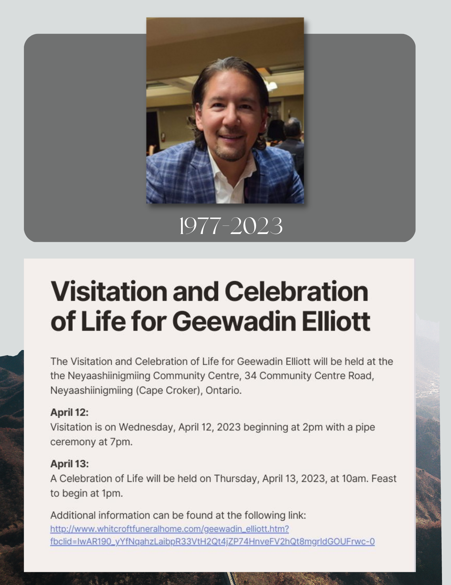 Apr 12 & 13: Visitation and Celebration of Life for Geewadin Elliott Posted on April 11, 2023April 11, 2023 Posted in Post Archives.